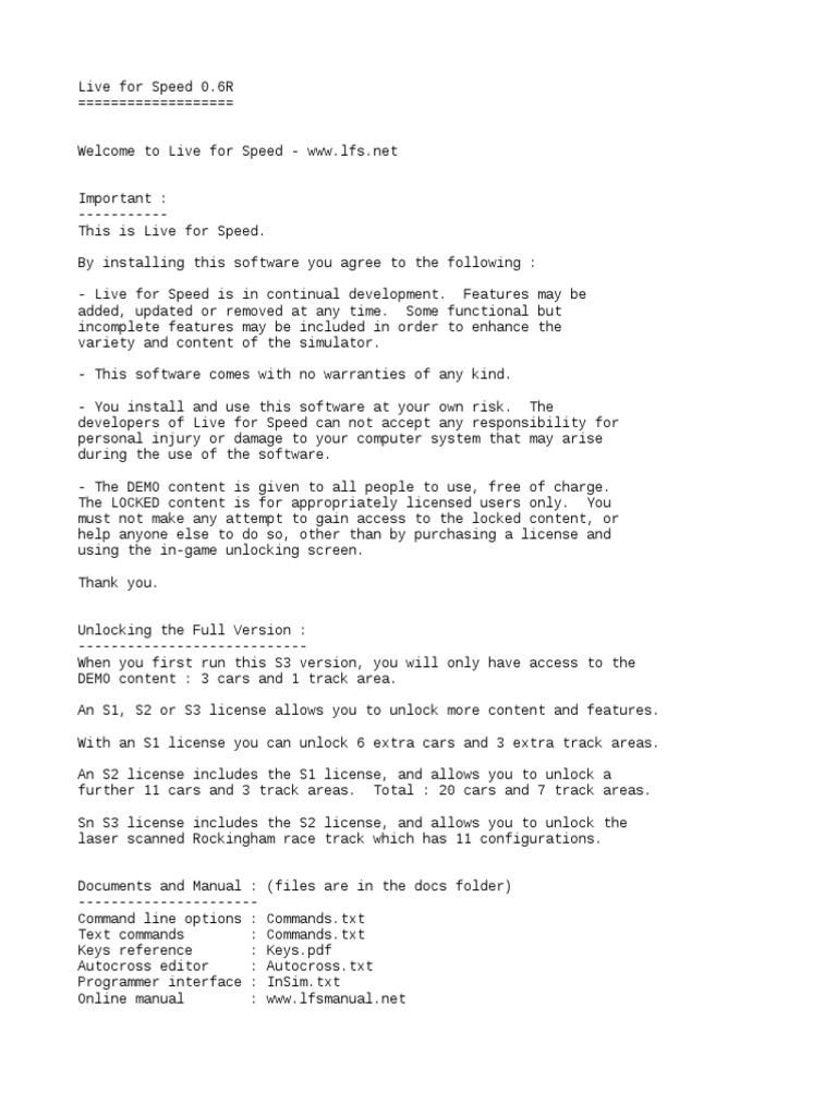 Lfs is entirely distributed via the internet. Browse live for speed s2 files to download full releases, installer, sdk,. No need to unlock this one as it comes free to for everyone who wants to run . Live for speed s2 mods live for speed s2 unlock code live for speed s2 keygen live for speed s2 license live for speed s2 unlocker free download Live for speed 0.6e s2 unlocker free lfs updated · 1. It can be downloaded and installed for free from the official website, but unlocking all of the features requires . It can be downloaded and installed for free from the official website, but unlocking all of the . A new patch for the live for speed s2 alpha has been released that will bring your version from y to z, adding new/updated interiors, interface/graphics . Copy unlocker.exe and unlocker.dll to the folder where game is . Now you are prepared to unlock live for speed s1/s2/s3. If you have purchased an s1, s2 or s3 license, you can unlock lfs using your lfs username and gamepassword. Live for speed download free full game (lfs) is a racing. Live for speed 0.6e s2 unlocker free lfs updated.